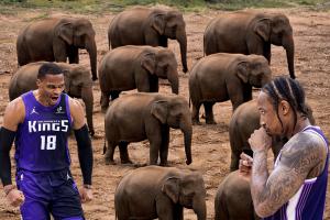 德罗赞愿帮威少跟大象打架😂哈登:我爱你们!但我先撤!