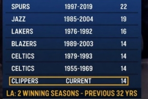 快船在队史的前32个赛季,只有2个赛季是胜率超5成的