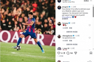 巴萨球员埃里克·加西亚社媒鼓励球队,他写道:“下周我们要在马德里完成逆转,我们知道自己有这个能力,会拼尽全力!感谢球迷整场比赛的支持。”